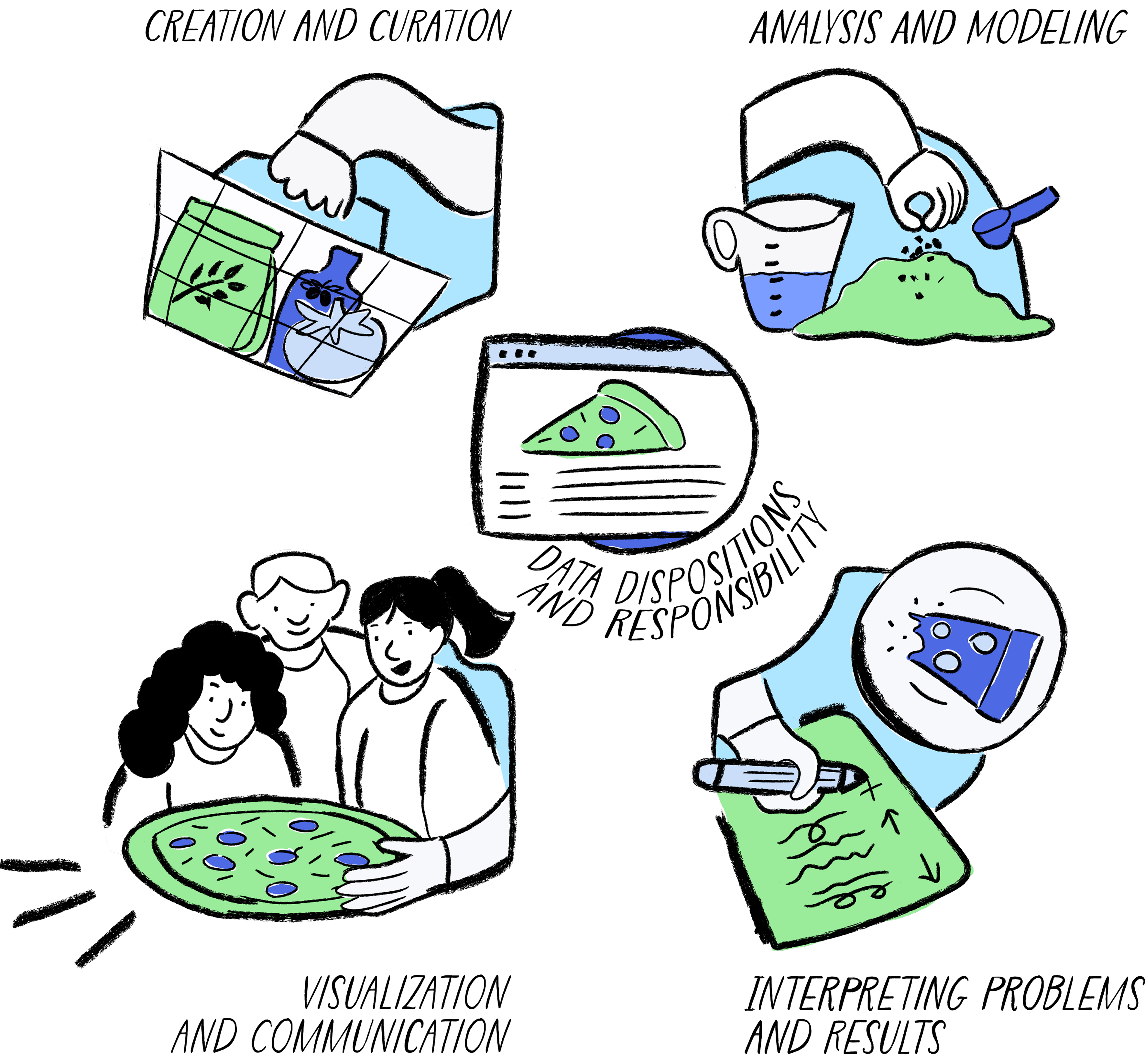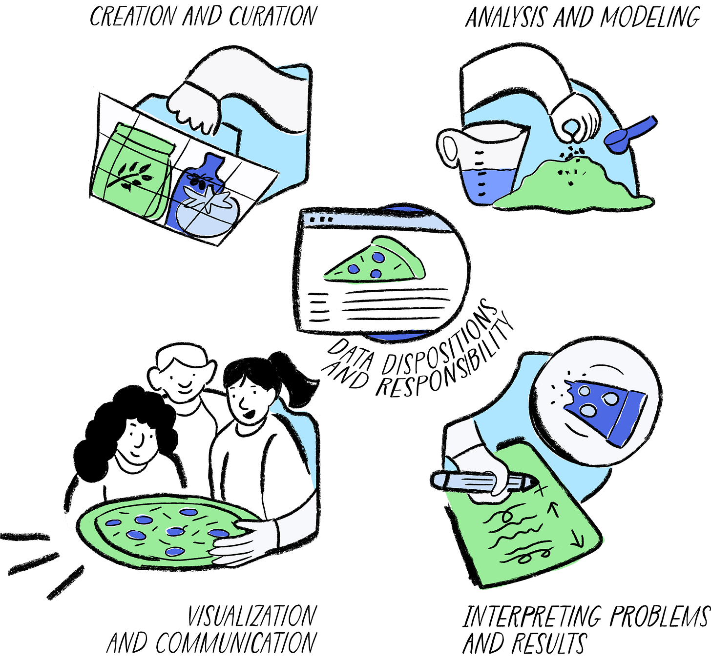 In the 2025 release of the K-12 Data Literacy and Data Science learning progressions, five strands, including one on dispositions and responsibility, are proposed and depicted as part of a pizza making metaphor (image 5).