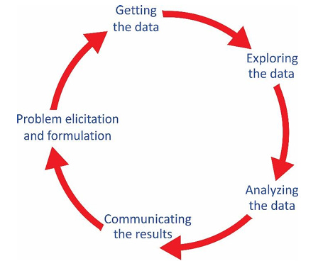 In 2019, the International Data Science in Schools Project (IDSSP) released a curriculum framework for guiding K-12 schools in how to introduce students to learning with and from data that included: problem elicitation and formulation, getting the data, exploring data, analyzing data, and communicating results (image 3).
