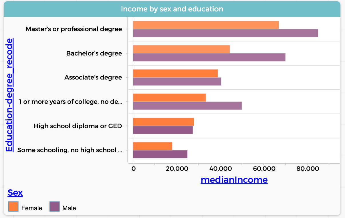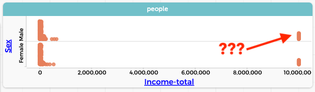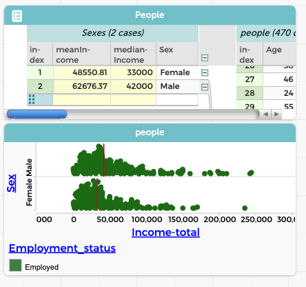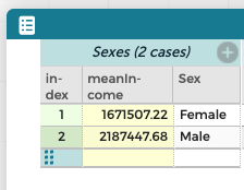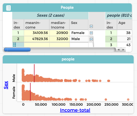 Let’s see an extended example. Suppose we want to explore gender differences in income. We might begin with the assumption that males earn more, but we want to verify that and even determine how much more males earn. So, we get a bunch of U.S. Census data using the CODAP Microdata Portal (I will use CODAP here, but you can easily do this sort of thing using any modern data-analysis platform). We begin (foolishly, as we will see) by grouping the data by sex (the Census uses “sex” rather than “gender”) and computing the mean of total personal income.
