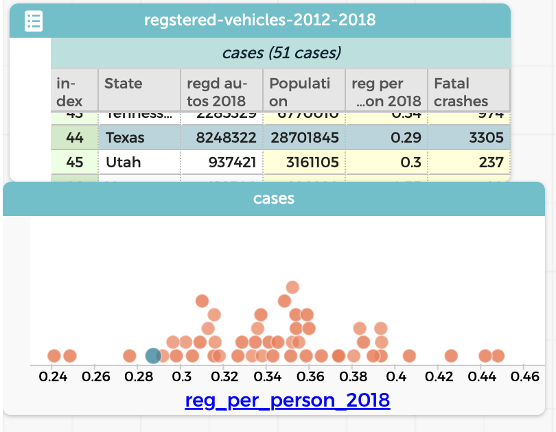 Again, the precise process depends on your software. The result is a single table with both columns; you then make a new column and perform the calculation data move. The result? Texas actually has the fourth-smallest number of cars per person!