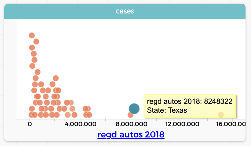 Sure enough, Texas (selected in the graph) has a lot. But we realize that Texas also has a large population, so really we should find out how many cars there are per person in each State. We want to do a calculation with a formula that will be something like (registrations / population). The trouble is, population is not a column in our table. So we get a second table with the state populations. To make the formula work, we need both the registrations and the population in the same table. That’s what requires a “join.”